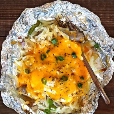 5: Place packets on a grate over the fire; cook 10 minutes or until potatoes are tender and eggs are cooked through, turning once. Open packets carefully and sprinkle with remaining cheese.